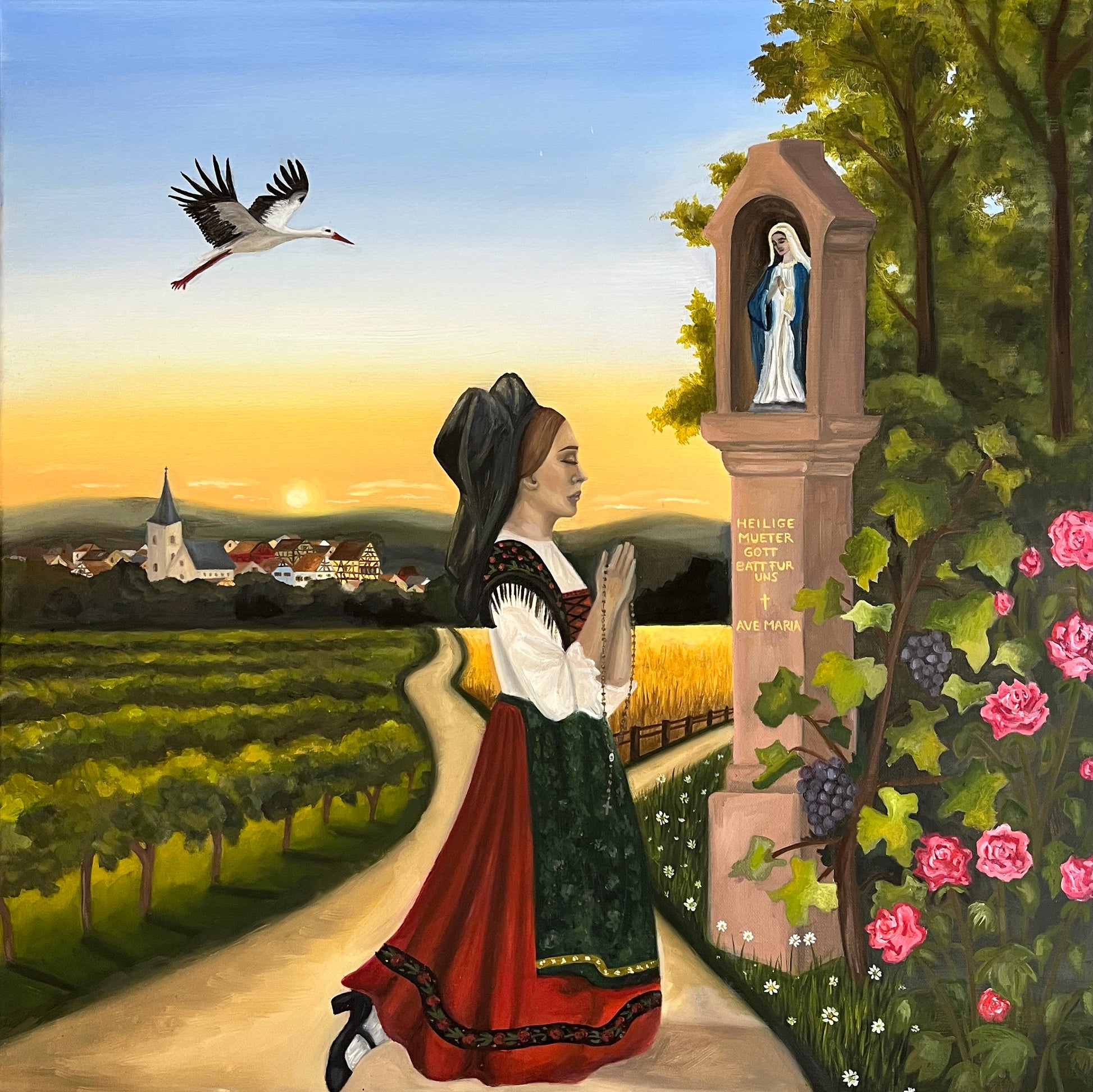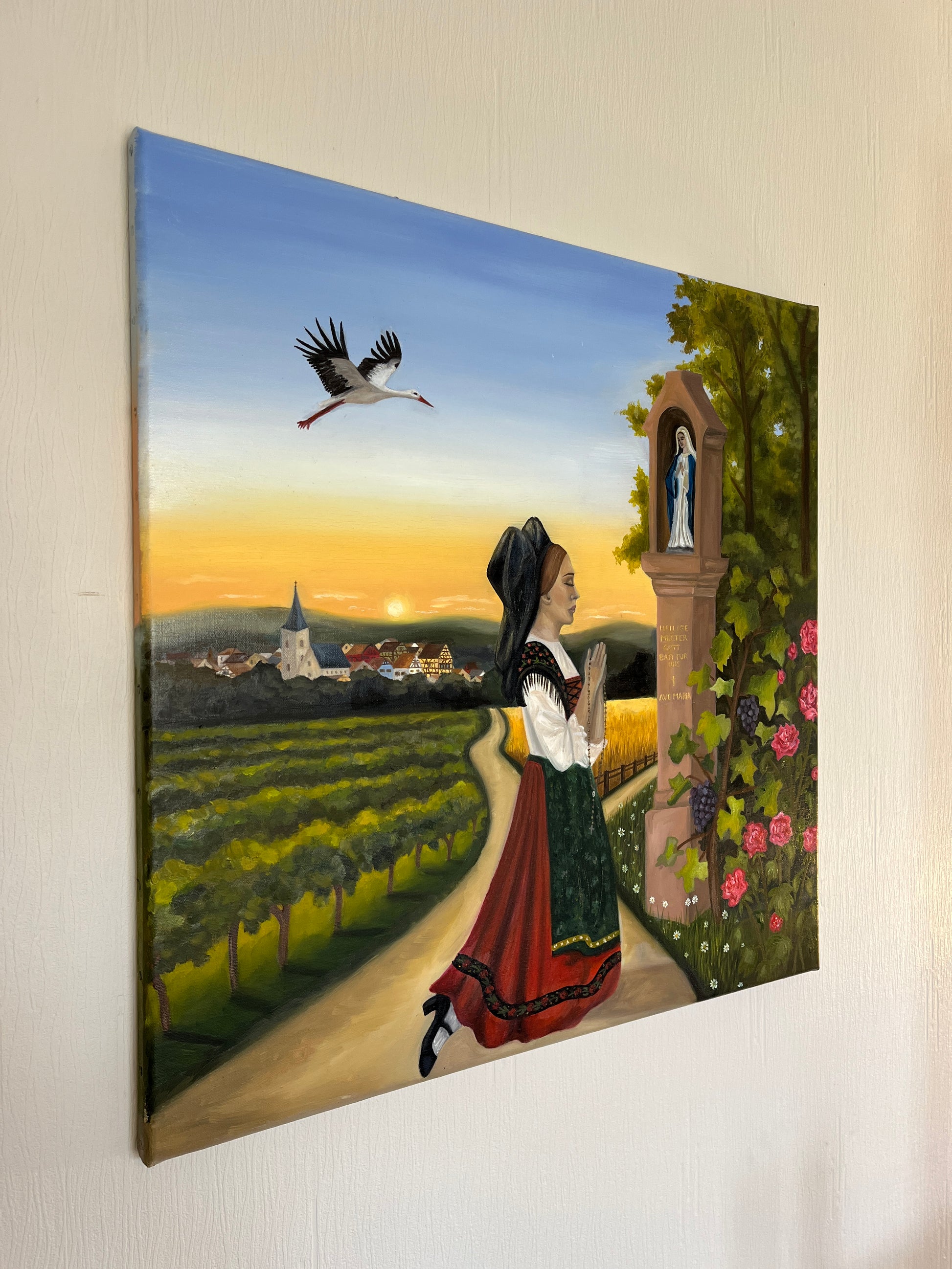 Dans cette vision personnelle de l’Alsace, la prière s’élève entre vignes et villages. Une jeune femme en costume traditionnel se recueille devant un Bildstock, tandis qu’une cigogne veille au-dessus du clocher. Œuvre colorée et inspirante, elle rend hommage à la foi, aux racines et à la beauté du patrimoine alsacien.