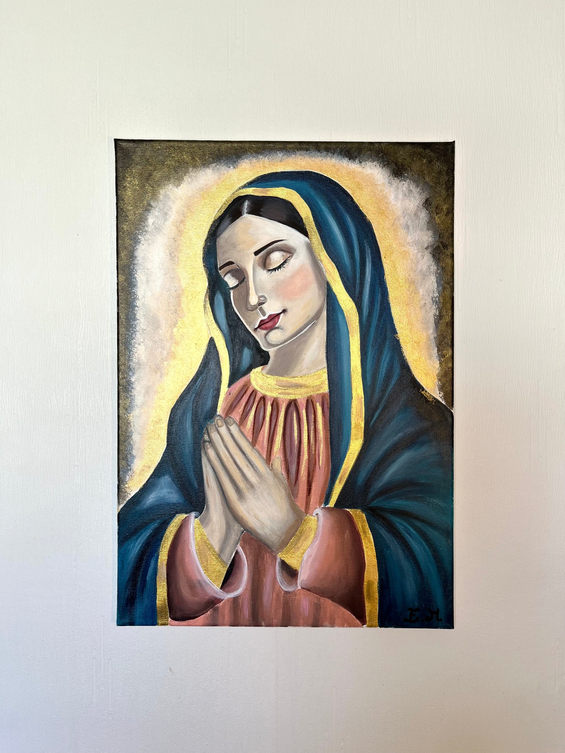 Représentée dans une attitude de prière et de douceur, la Vierge Marie incarne la paix et la pureté. Le fond doré illumine son visage recueilli, symbole de lumière divine.