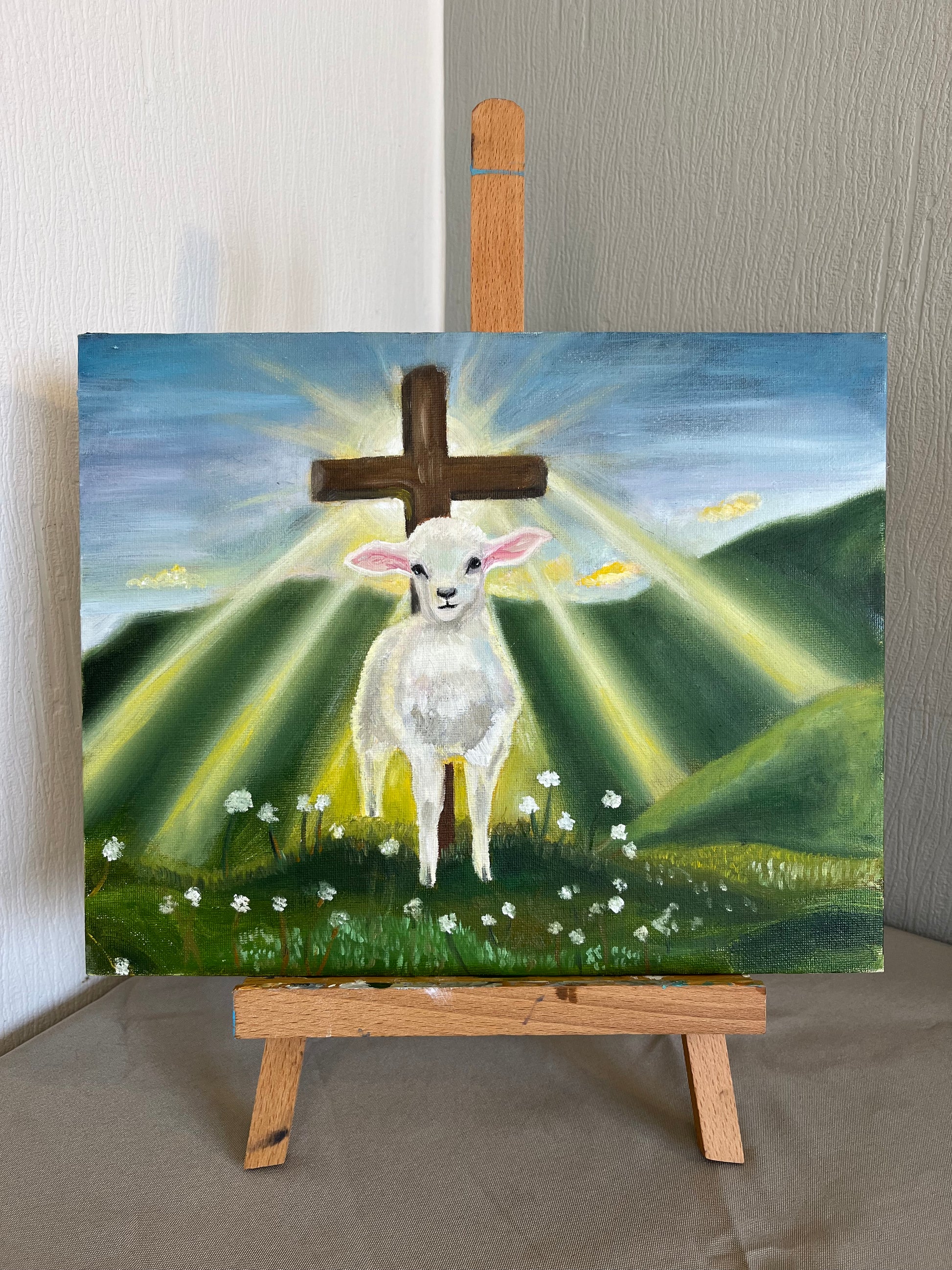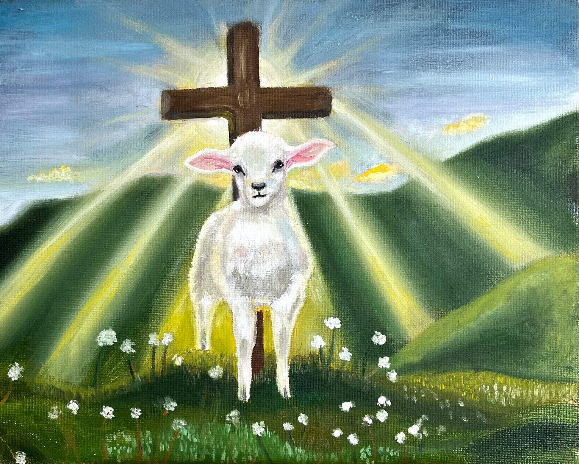 Un agneau se tient devant une croix, baigné de lumière. Les rayons dorés et le paysage verdoyant évoquent la paix, la pureté et l’espérance.