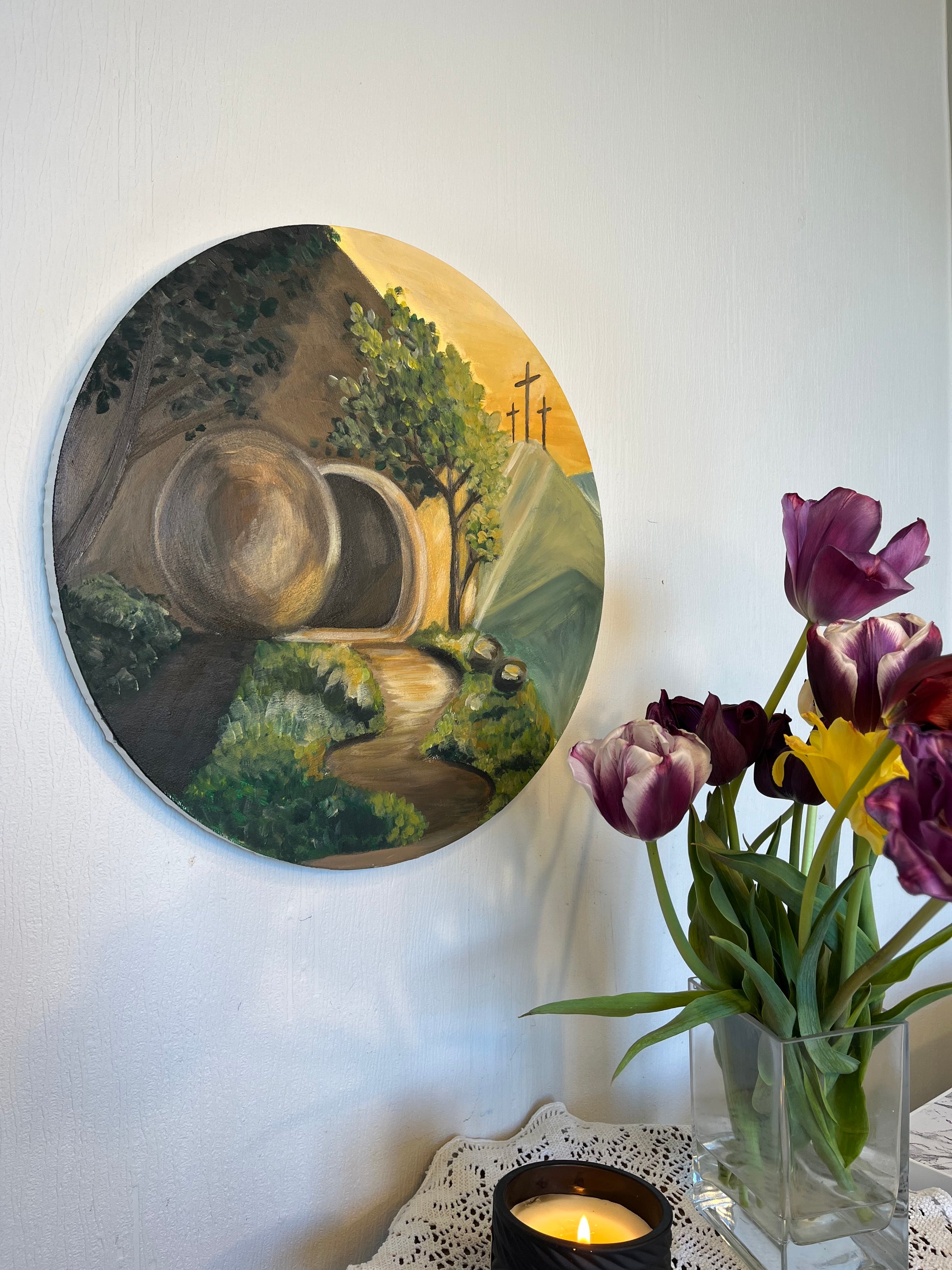 Dans la douceur de l’aube, la lumière pénètre le tombeau désormais ouvert. Symbole de résurrection et d’espérance, cette scène évoque la victoire de la vie sur la mort et la promesse d’un renouveau éternel.