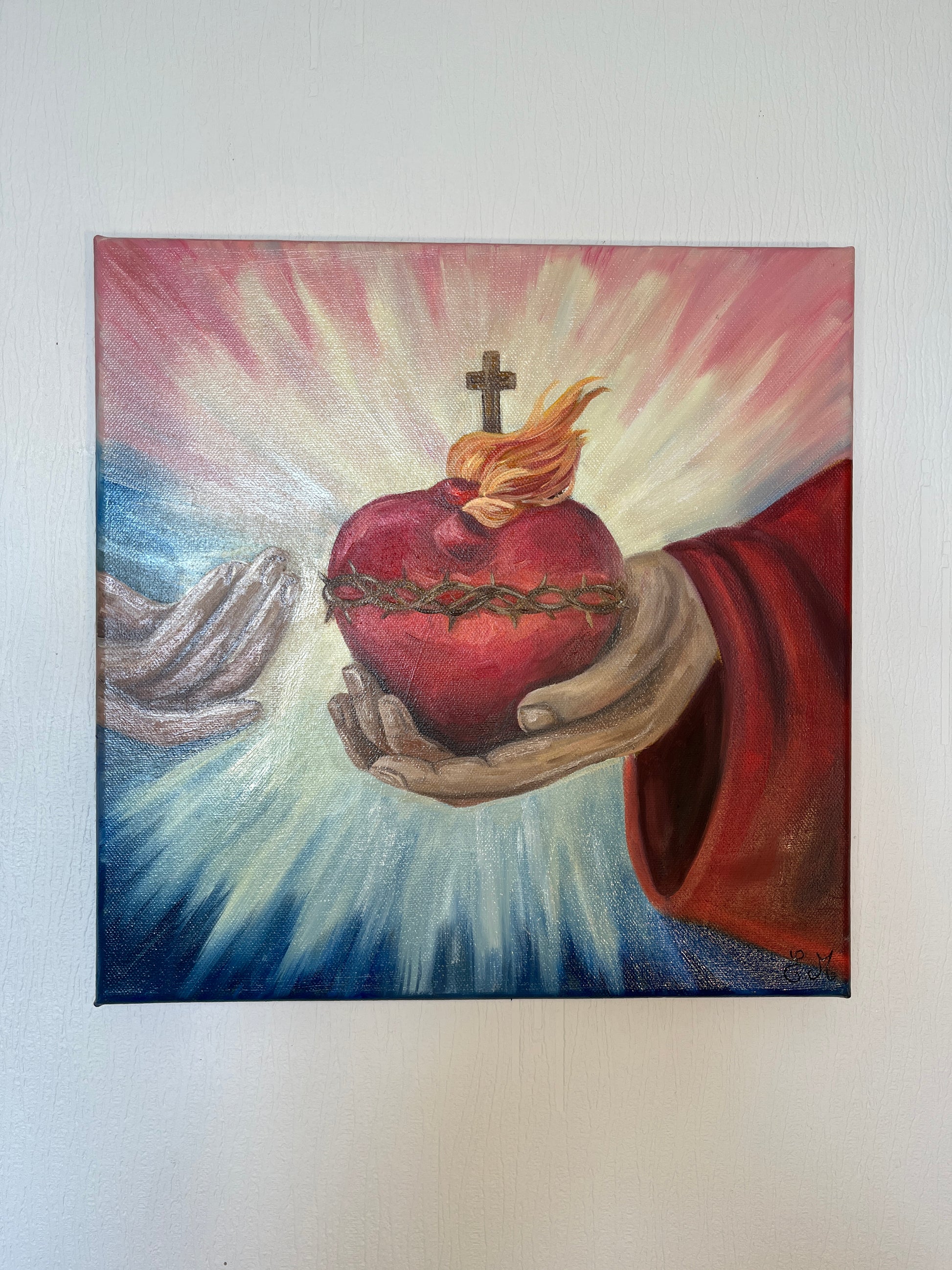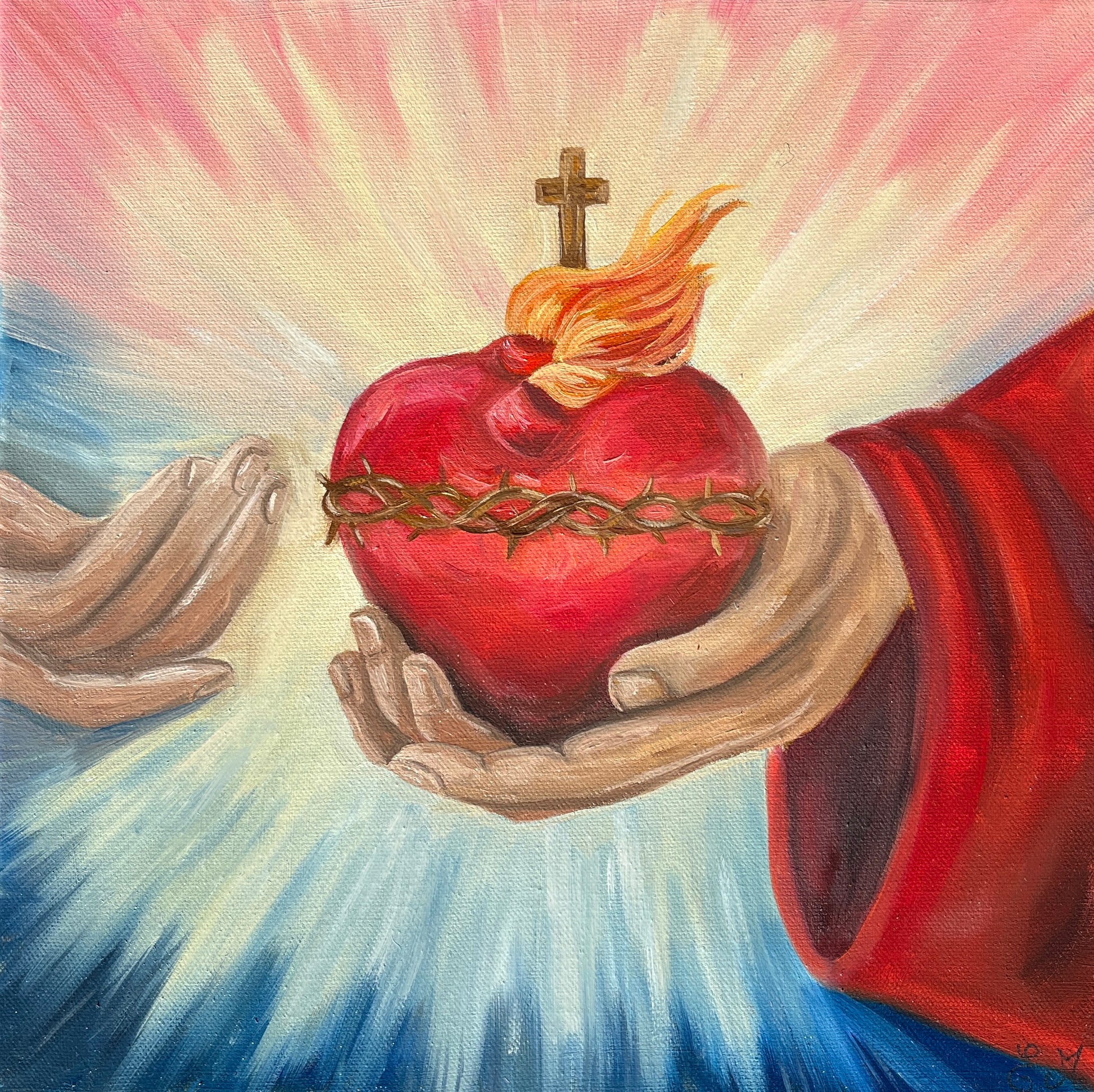 Symbole d’amour et de miséricorde, le Sacré-Cœur se déploie ici dans toute sa lumière. Remis entre les mains de l’humanité, il exprime le don total et la tendresse infinie du Christ.