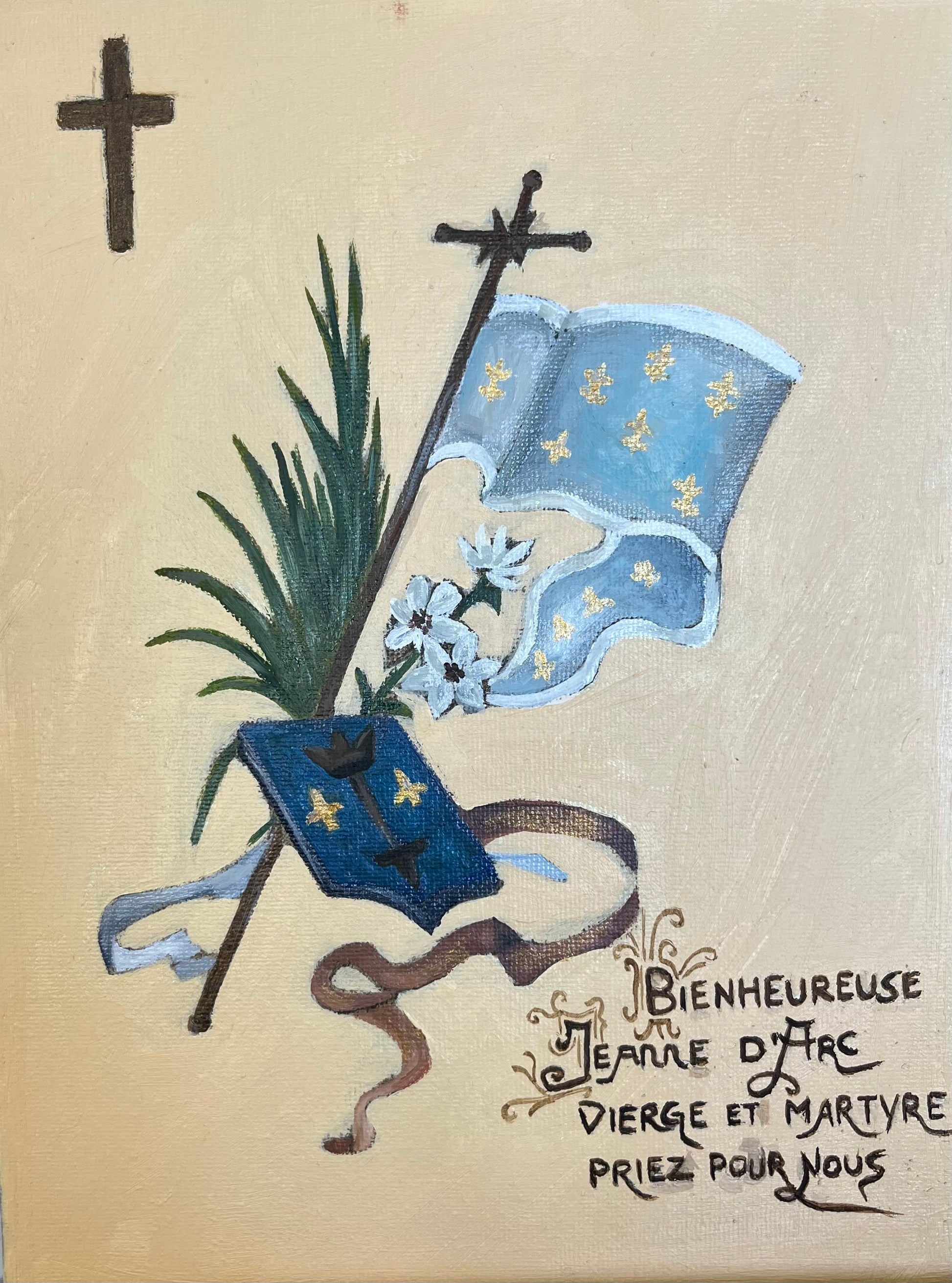Cette composition met à l’honneur les emblèmes de Jeanne d’Arc : l’étendard, la palme et les lys, symboles de pureté, de foi et de victoire. L’œuvre célèbre la sainteté et le courage de la “Pucelle d’Orléans”.