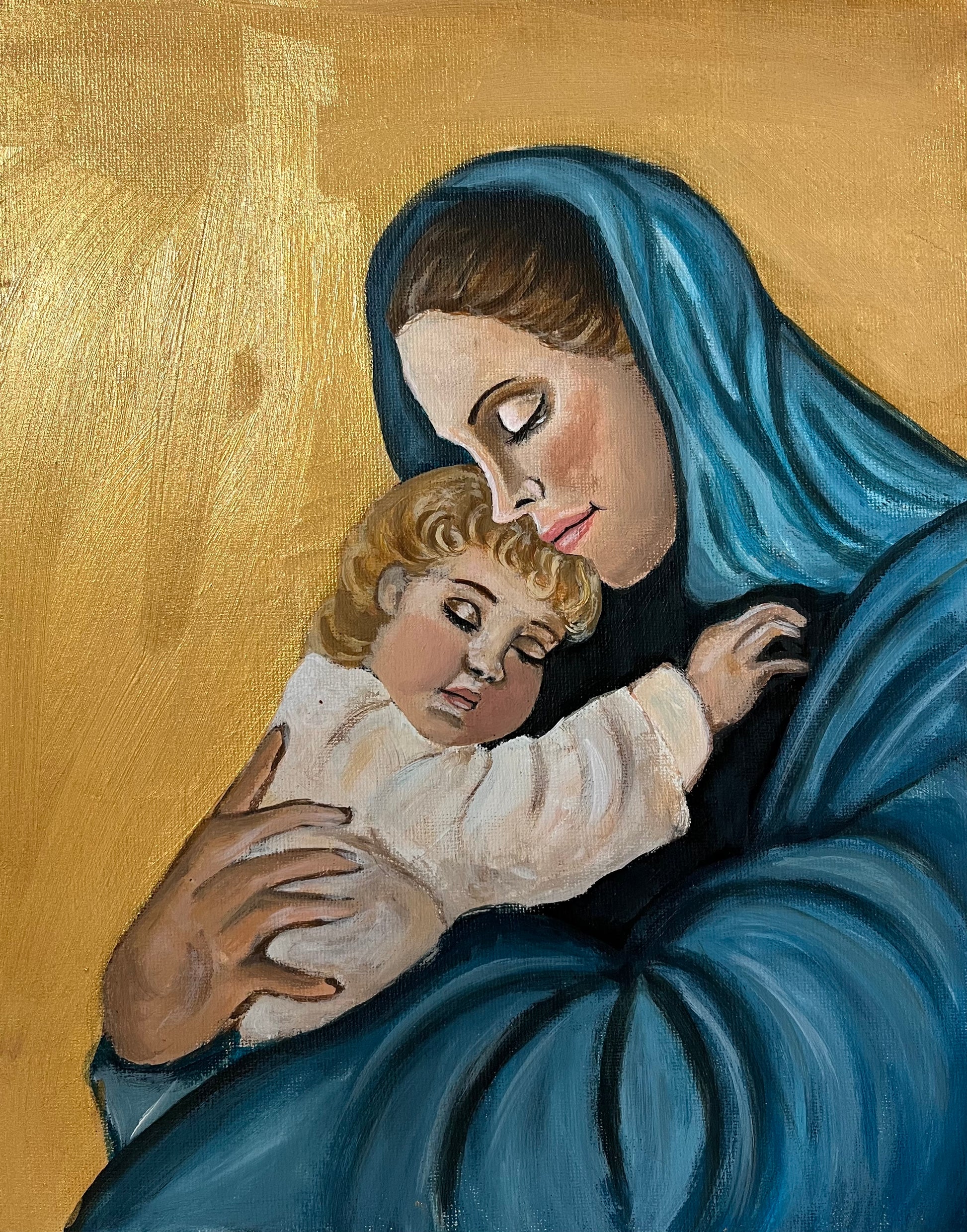 Une représentation pleine de tendresse, où Marie serre l’Enfant Jésus contre elle dans un geste de réconfort et de paix.